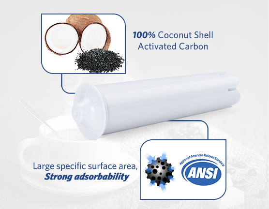 We use 100% coconut shell activated carbon as the material which can effectively remove over 90% free Chlorine residual, sediment, some organic compoundsodors and filter the bacteria in water to keep cleanness of filtered water which can encourage pets to drink more and get the proper hydration essential to their health.