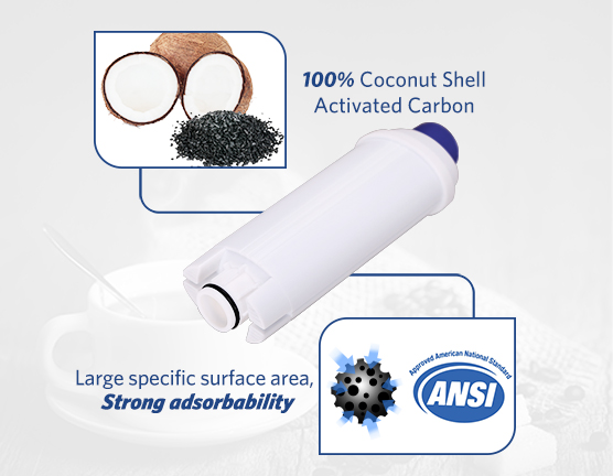 We use 100% coconut shell activated carbon as the material which can effectively remove over 90% free Chlorine residual, sediment, some organic compoundsodors and filter the bacteria in water to keep cleanness of filtered water which can encourage pets to drink more and get the proper hydration essential to their health.